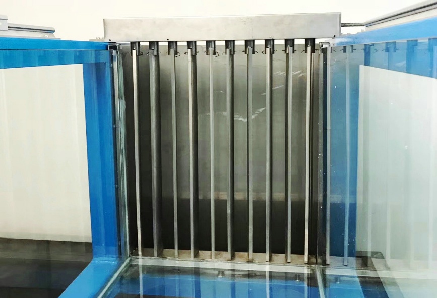 玻璃水槽尺寸为15m(长)×0.8m(宽)×1m(高),玻璃段长14m,为可变坡度水槽,最大坡度为3°。水槽为一体式钢结构,钢化玻璃厚度15mm。