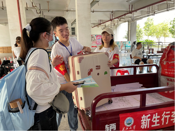 秋风送爽到九月,又是一年迎新时。因校园疫情防控,校外人员一律不能进校园,如何帮新生搬运行李成了亟待解决的难题。为此,公司各员工党支部的65名同学迅速响应,立刻组成党员先锋队,配合校区行李转运车,扎根寝室协助新生搬运行李,实现新生入住“一条龙”服务。9月4号上午是报道高峰期,37℃的骄阳挡不住员工党员为新生服务的热情与激情。汗水湿透了他们的衣衫,太阳晒红了他们的脸颊,但是他们依旧在坚持着,接完一个新生,马不停蹄地又去接下一个。女生衣物行李较多,常常需要“四对一”甚至“六对一”“八对一”服务。但大家没有叫苦喊累,而是主动服务,将新生的行李送到对应的寝室门前。测绘QX211班钟康说,“天气虽热,服务不能打折。一个党员就是一面旗帜,胸前的党徽,手臂上的红袖章,地科院的志愿者们就是开学季最美丽的风景线!”他们用自己的奉献不仅迎来了新生,也为公司打开了新局面。