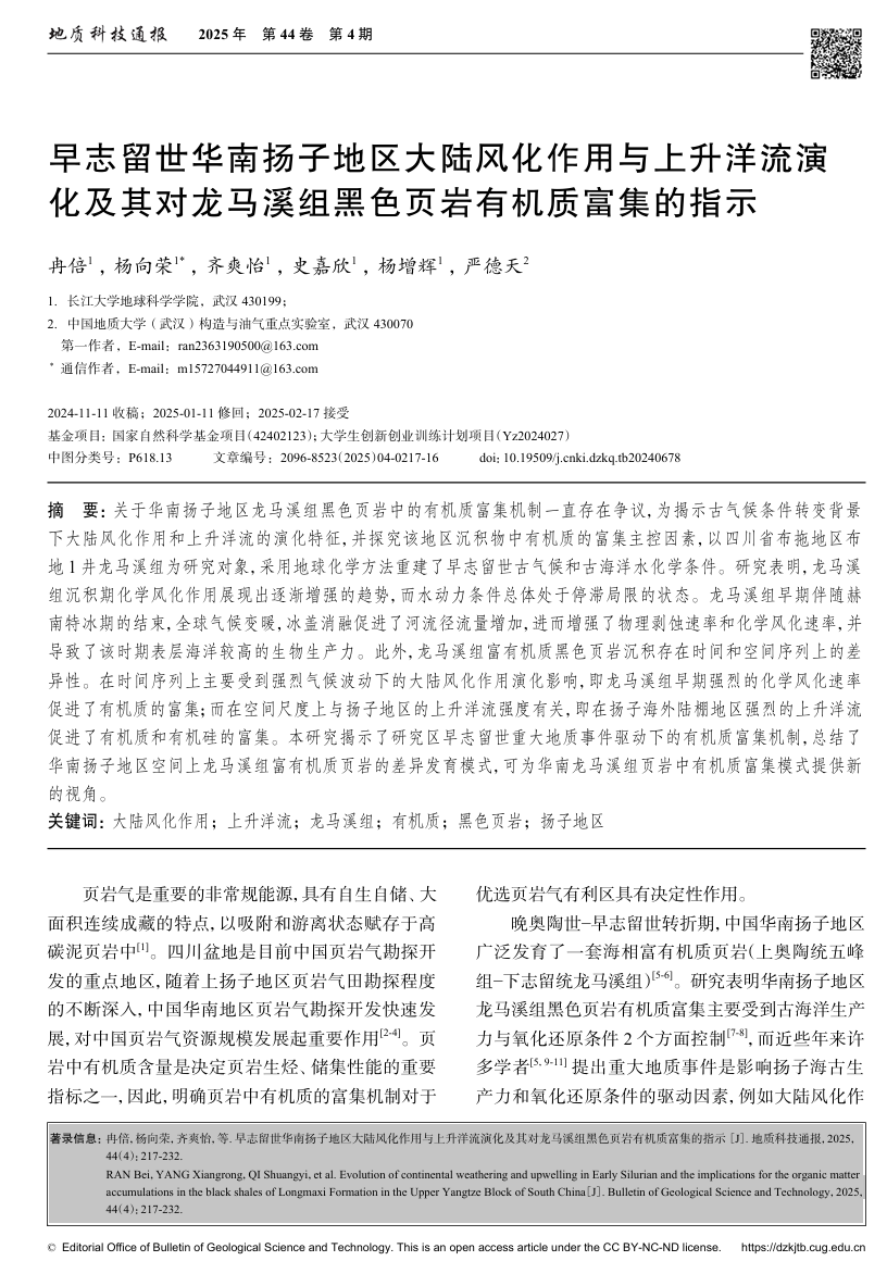 bevitor伟德22级本科生冉倍在核心期刊《地质科技通报》上发表了题为《早志留世华南扬子地区大陆风化作用与上升洋流演化及其对龙马溪组黑色页岩有机质富集的指示》的论文(共20页)。本科生冉倍为论文第一作者,其导师杨向荣为通讯作者。文章重点讨论了大陆风化作用与上升洋流影响下,早志留世华南扬子地区龙马溪组黑色页岩有机质富集机制。
