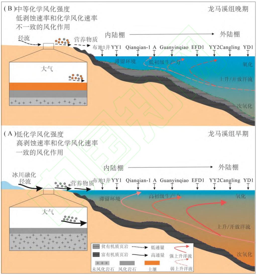 晚奥陶世-早志留世转折期,中国华南扬子地区广泛发育了一套海相富有机质页岩(上奥陶统五峰组-下志留统龙马溪组)。目前,研究认为华南扬子地区龙马溪组黑色页岩有机质富集主要受到古海洋生产力与氧化还原条件两个方面控制,而近些年来许多学者提出重大地质事件是影响扬子海古生产力和氧化还原条件的驱动因素,例如大陆风化作用、上升洋流、火山活动对高生产力的促进作用,气候变冷、海平面降低则导致了海洋的富氧。针对早志留世华南扬子地区下志留统龙马溪组黑色页岩有机质富集主控因素为大陆风化作用或上升洋流仍旧存在争论,并且针对不同区域大陆风化作用与上升洋流的差异对比,及其对整个区域上龙马溪组富有机质页岩沉积的影响仍需进一步研究。