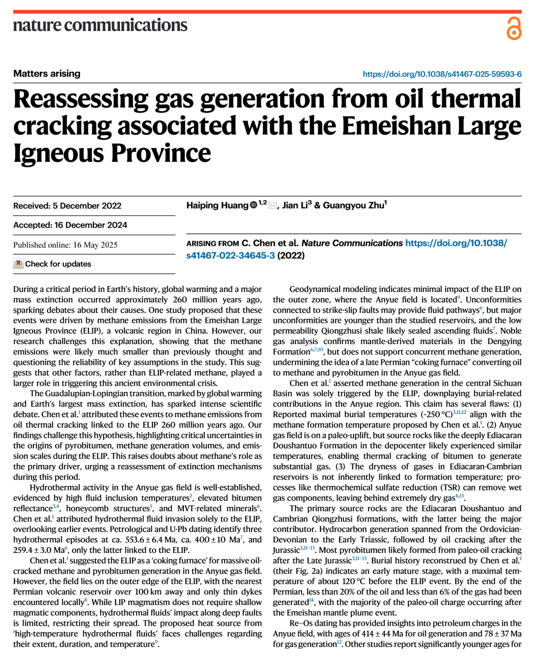 (通讯员 卢志远)近日,bevitor伟德黄海平教授等在国际顶级期刊《Nature Communications》上发表题为《Reassessing gas generation from oil thermal cracking associated with the Emeishan Large Igneous Province》的论文,对峨眉山大火成岩省(ELIP)诱发的原油裂解释放甲烷是否是二叠纪末全球气候剧变和生物大灭绝的主要原因提出了讨论,并对甲烷的生成与释放量进行了重新评估。