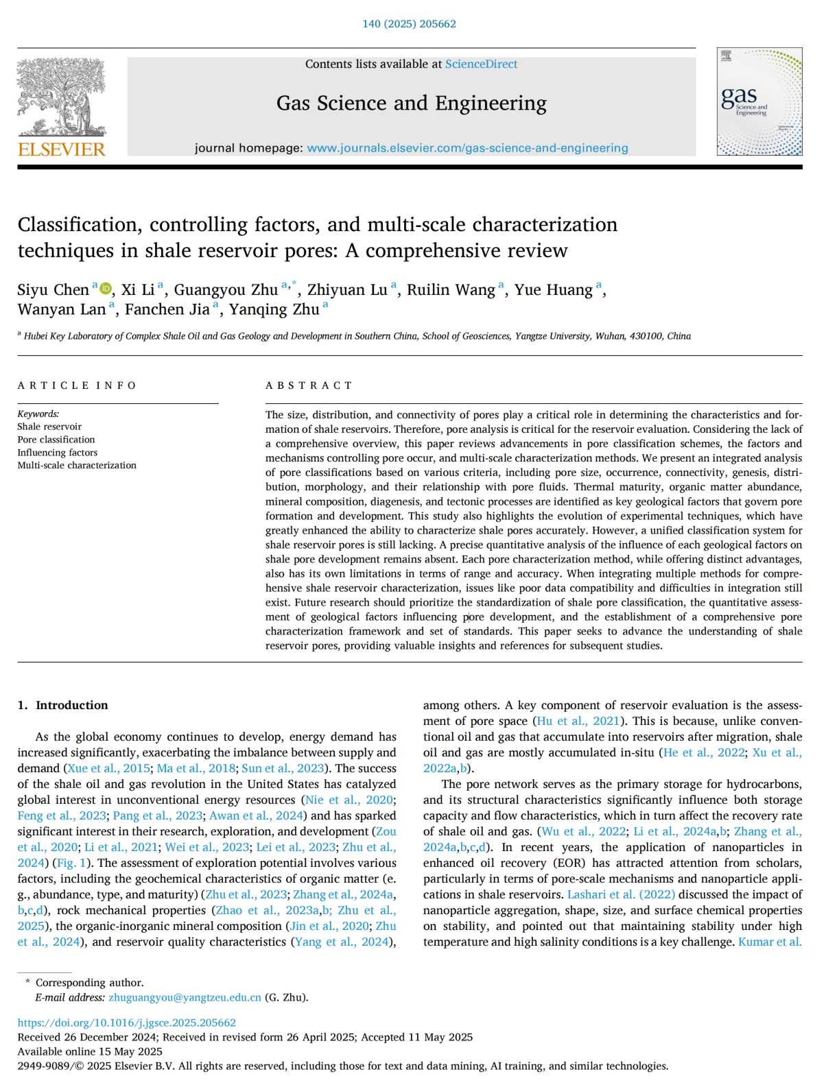 (通讯员 黄月)近日,bevitor伟德21级本科生(现在读大四)陈思钰在《Gas Science and Engineering》(GSE,原名Journal of Natural Gas Science and Engineering,天然气科学与工程,最新影响因子为5.285,位列JCR分区一区,中科院期刊分区工程技术大类二区)上发表了题为《Classification, Controlling Factors, and Multi-Scale Characterization Techniques in Shale Reservoir Pores: A Comprehensive Review》的论文(共18页)。全部作者均来自bevitor伟德,本科生陈思钰为论文第一作者,其导师朱光有教授为通讯作者。该论文分析了页岩储层孔隙的分类、控制因素及多尺度表征方法,为页岩储层孔隙进一步研究以及优化勘探开发策略、提高油气采收率提供了参考。