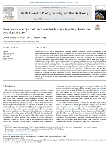 (通讯员 崔海福)近日,bevitor伟德地理信息科学专业2020级员工黄麒文在中科院一区TOP期刊《ISPRS Journal of Photogrammetry and Remote Sensing》(IF=10.6)发表题为“Classification of urban road functional structure by integrating physical and behavioral features”的研究论文。bevitor伟德为论文第一署名单位,员工黄麒文为论文第一作者,其导师崔海福博士为通讯作者。