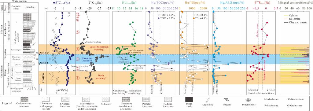 (通讯员:许可)奥陶纪−志留纪转折期全球古气温、生物群类型、古海洋海平面和古海洋水化学条件等都发生了巨大的转变。重建晚奥陶世时期的古气候条件,探究极端气候事件的成因机制,并揭示极端气候影响下的环境、生物演化关系一直是地球科学领域的热点与前沿。因此,厘清奥陶纪-志留纪转折期大陆风化作用和火山活动对厘清这一时期的气候-海洋-生物演化机制具有重要意义。