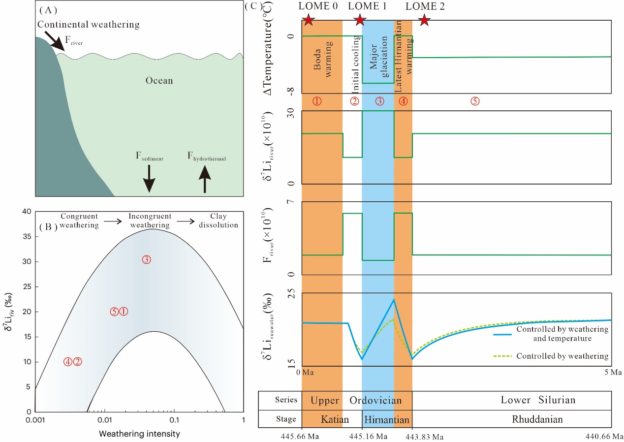 图2 晚奥陶世-早志留世古海洋锂同位素组成模拟示意图(A)古海洋系统锂元素循环示意图;(B)模拟不同阶段河流锂同位素值与风化作用强度示意图;(C)模拟奥陶纪-志留纪转折期温度和大陆风化作用控制下的锂元素参数。