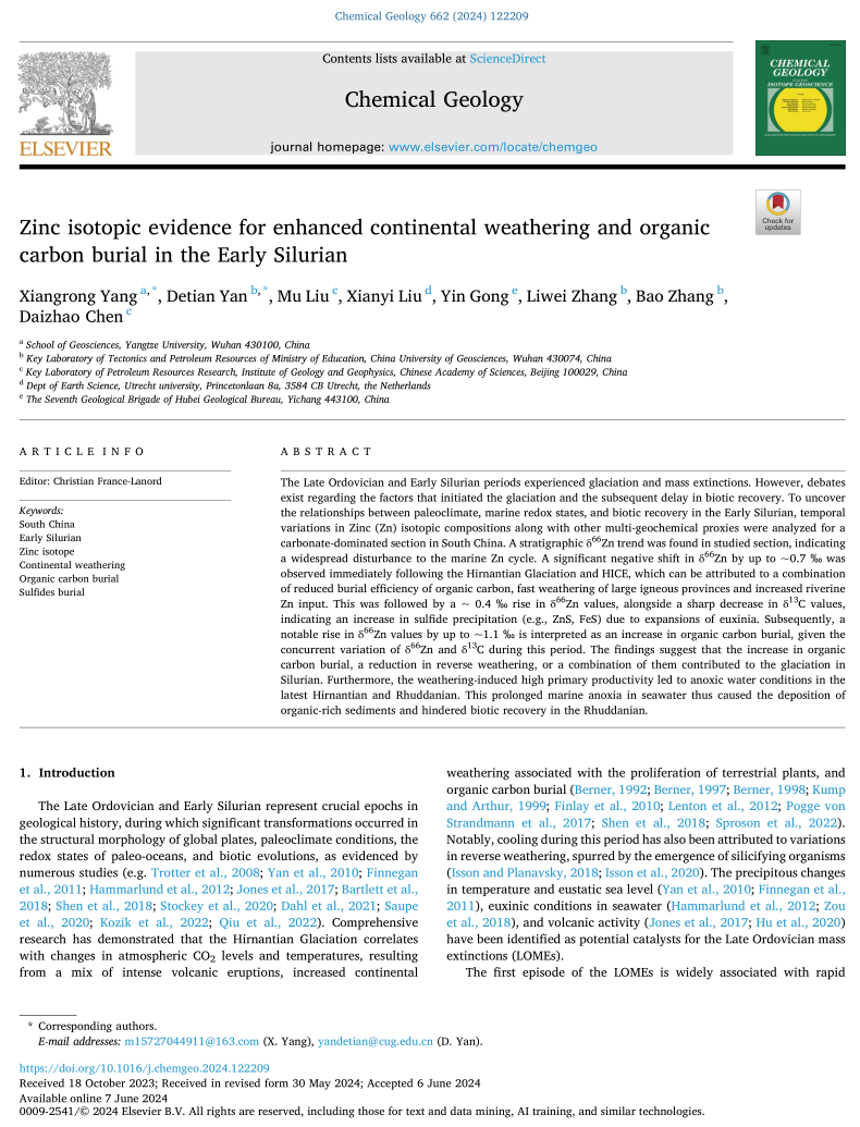 bevitor伟德地质系教师杨向荣在地学TOP期刊《Chemical Geology》上发表题为“Zinc isotopic evidence for enhanced continental weathering and organic carbon burial in the Early Silurian”的研究论文。