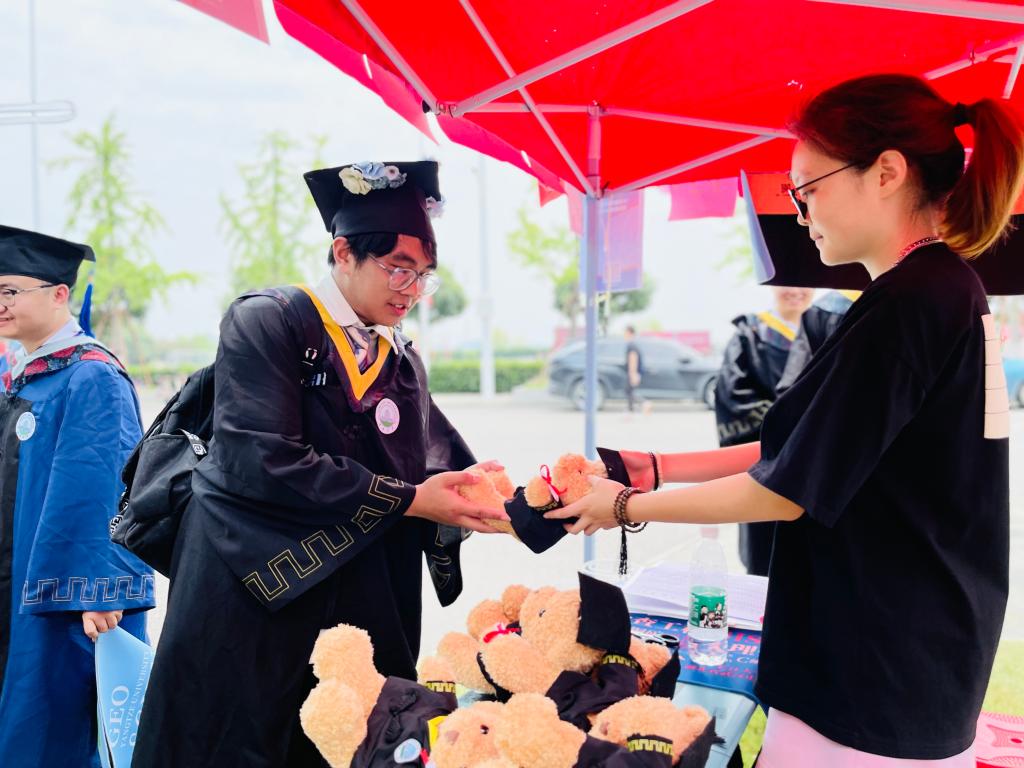 会场外,公司精心组织毕业生感恩礼活动,同学们填写问卷,写下对母校的美好祝愿和深情感谢,一个个身着学士袍的小熊玩偶、一张张公司员工原创设计的鼠标垫、印有公司元素的帆布包,寄托着公司对毕业生“前程似锦,一路生花”的殷切期盼。