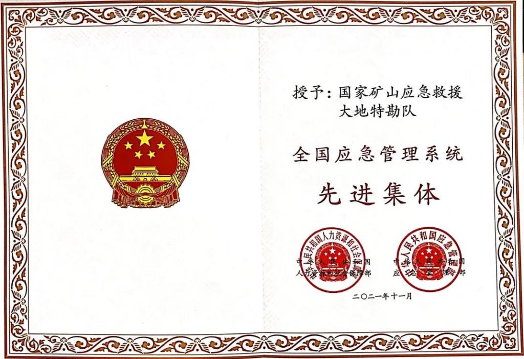 国家矿山应急救援大地特勘队于2012年9月由国家安全生产监督管理总局正式批准成立,是一支依托中央地勘企业建设的国家矿山应急救援专业队伍,担负着全国重特大、特别复杂矿山事故钻探救援的应急救援任务。2021年因在山东栖霞市笏山金矿“1·10”重大爆炸事故救援贡献突出,被国家应急管理部授予“集体二等功”,被中国煤炭地质总局授予“英雄救援队”荣誉称号。