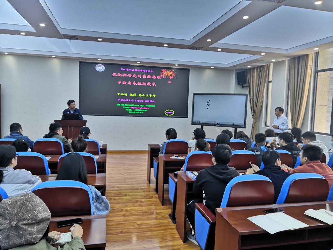 讲座正式开始,于教授给所有人提出了八大沉积地质学问题,这种开题的方式,着实新颖,紧紧抓住了台下每一位师生的注意力。于老师通过简单的现象,引发员工以系统地质思维思考常见的地质现象,这是日常课堂中难以学习到的。于教授结合几十年的科研、生产与教学经验,以碎屑岩沉积相为讲授主题,以成因为主导,系统介绍了如何对碎屑岩沉积相进行系统研究,具体介绍了:岩心观察的科学方法、井震结合划分层序、小层对比原则、平面沉积相图编制方法等。通过具体案例分析,于教授总结出了若干条地学哲学思维并分享给大家,如科学证据是基础、地质模式为导向、微观向宏观分析、宏观向微观思维、现象描述为外延、成因分析为内涵,这些深刻的哲学思维引发了在座师生的强烈反响,为我们今后的学习与科研提供了思想指导。