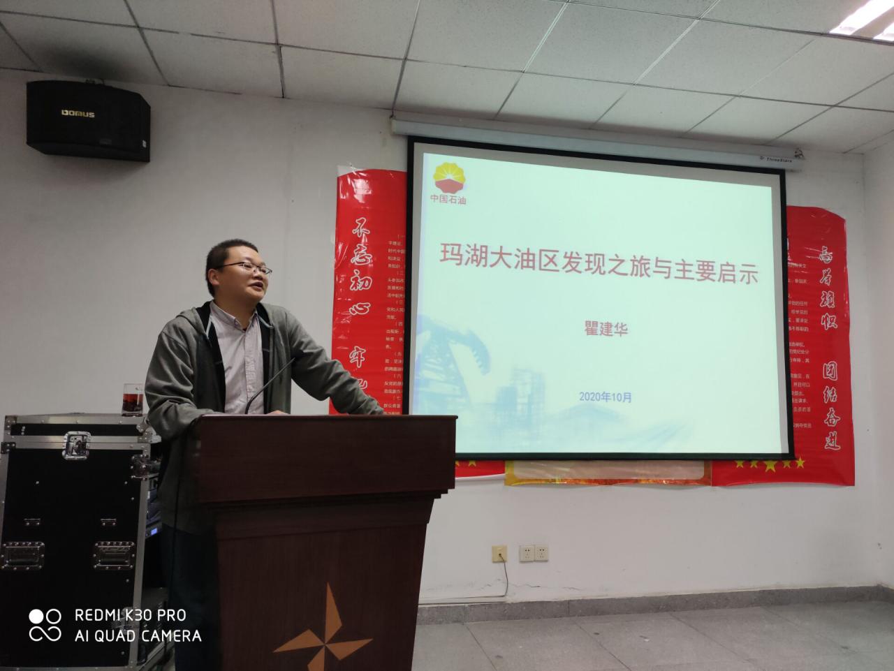 瞿建华以玛湖大油区发现的七大战役为主线,通过“三上斜坡区,新认识新技术带来新突破”、“新老井联动,大面积含油构想初步验证”、“相邻扇拓展,西斜坡百里油区快速落实”、“坚持东斜坡,两翼齐飞喜现又一大场面”、“探索玛中区,中间开花满凹含油显曙光”、“回头看二叠,南部大油区轮廓逐步清晰”和“一体化推进,增储与建产并进渐入佳境”七个故事重现了玛湖大油区发现的全过程。结合多年油气勘探的经历,他提醒员工们在油气勘探过程中应坚守“油气勘探,贵在‘创新’,要在坚持中求变,在变化中坚持。”和“没有解放不了的油气,只有解放不了的思想”的信念。在提问环节,瞿建华针对老师和员工们提出自己问题认真详细地进行了解答,并指出我国中西部油气勘探程度低,为青年员工提供了建功立业的广阔舞台。
