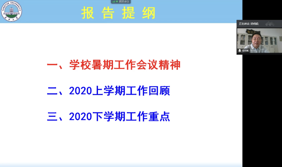 党委书记江万哲做总结发言。他对下阶段工作提出三点要求:一是学习新方案,落实常态化疫情防控工作;二是把握新要求,落实立德树人工作;三是认领新任务,落实各项事业发展工作。江书记强调,全体教职工要坚持日报告和零报告,控制和减少集体活动,无必须不外出,出行必报备,教学活动和疫情防控要同步安排。江书记还与参会教职工一起学习了习近平总书记系列重要讲话,号召大家要讲政治、树正气,做“四有”好老师;要将立德树人理念融入专业人才培养、融入课程教学大纲、融入课堂教学,大力推进课程思政,培养德才兼备、担当重任的社会主义建设者和接班人。