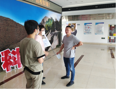 石油科技大楼的公司大厅里,朱正平老师正和地信系的两名毕业生交流着,询问他们关于毕业后的计划、选择,并叮嘱他们既要努力奋斗又要照顾好自己。最后朱老师还表示分别总是难免的,期待同学们的未来更加辉煌、多彩。
