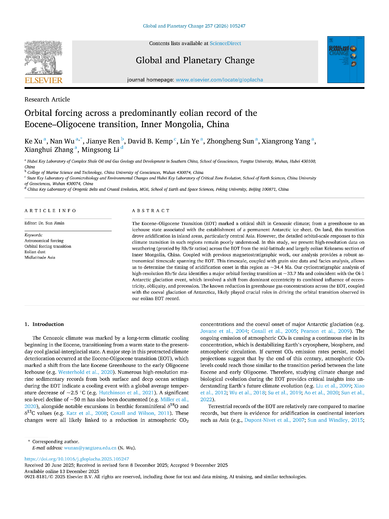 始新世–渐新世过渡期(EOT)是新生代气候演变的关键转折点,标志着地球从“温室”状态进入“冰室”状态,南极永久冰盖开始形成。在这一时期,内陆亚洲地区普遍出现干旱化,但其干旱化的具体时间、过程及轨道尺度的响应模式,长期以来缺乏高分辨率记录的约束。为厘清上述问题,本研究对我国内蒙古克克阿木剖面风成沉积地层进行了高分辨率取样(5 cm),获取了约27 m长的Rb/Sr和粒度数据。通过将这些新指标与已发表的磁性地层学成果整合,研究团队首次建立了该剖面高精度的绝对天文年代标尺。研究表明,该地区在约34.4 Ma发生了从河漫滩环境(34.4 Ma以前)向风成沉积(34.4 Ma至今)的环境转变,这标志着本地区干旱化的起始时间。这一转变很可能由全球变冷、大气CO₂浓度下降及区域构造活动共同驱动。更重要的是,在约33.7 Ma发生了显著的轨道周期转变:从以偏心率主导转变为偏心率、斜率和岁差的共同影响,这一转变与南极Oi1冰盖事件在时间上高度吻合。研究指出,EOT期间全球温室气体浓度下降和南极冰盖增长的协同作用,是驱动亚洲内陆气候系统轨道响应模式发生转变的关键机制。该研究不仅为亚洲内陆干旱化进程提供了重要的年代参考,也揭示了轨道作用力在重大气候转型期的调控作用。这一成果对理解地球系统在重大气候临界期的行为提供了关键证据。研究同时指出,未来需结合气候模拟与动态古地理重建,进一步揭示EOT时期轨道–冰盖–构造–大气之间的耦合机制。