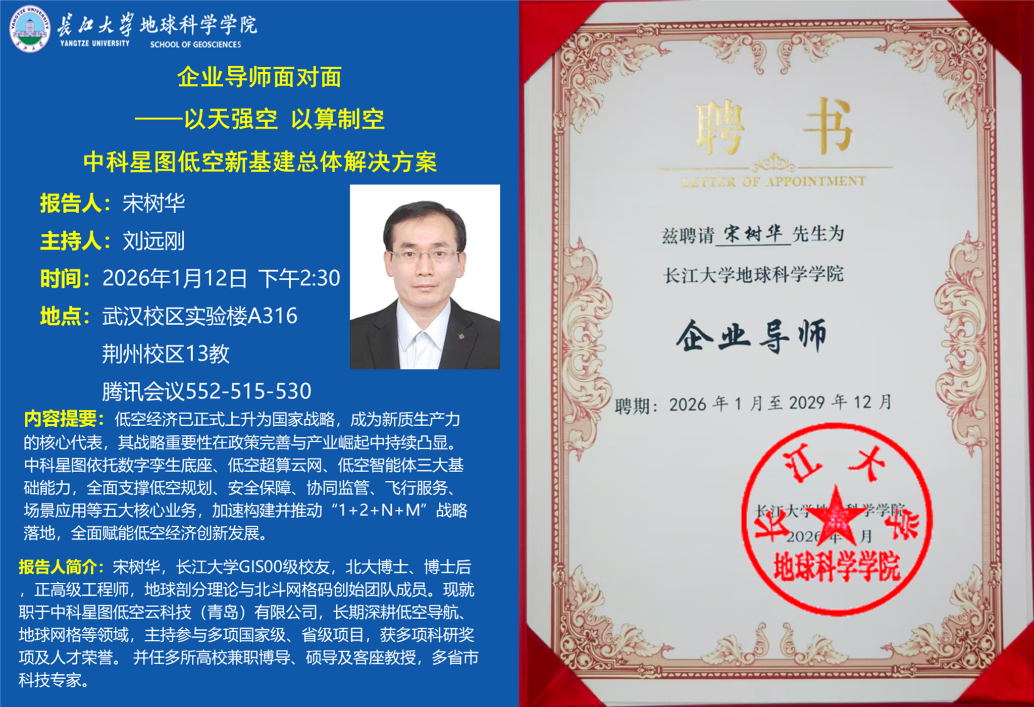 (通讯员:井然)2026年1月12日下午,bevitor伟德“企业导师面对面”活动在武汉校区实验楼A316及荆州校区13教D425线上线下同步举行。本次讲座特别邀请了地信00级员工、中科星图低空云科技(青岛)有限公司技术总师宋树华博士作为主讲嘉宾,为公司师生带来了题为“以天强空 以算制空——中科星图低空新基建总体解决方案”的专题报告。会议由地信系主任刘远刚主持,bevitor伟德100余名师生通过线上线下结合的方式参与了此次交流。