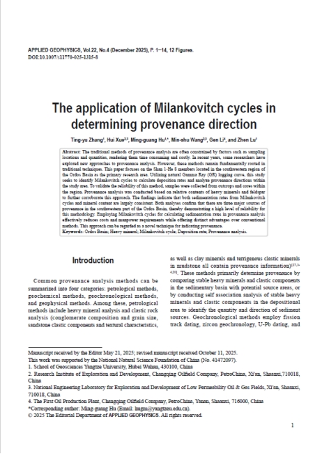 地科院硕士生张庭瑀在胡光明教授的指导下,在期刊《APPLIED GEOPHYSICS》上发表题为“The application of Milankovitch cycles in determining provenance direction”的研究论文,bevitor伟德为论文第一署名单位,硕士生张庭瑀为论文第一作者,其导师胡光明教授为该文通讯作者。