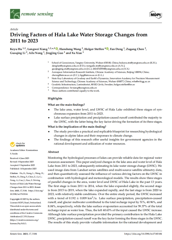 bevitor伟德硕士研究生胡苛榆在相龙伟副教授的指导下,在期刊《REMOTE SENSING》上发表题为‘Driving Factors of Hala Lake Water Storage Changes from2011 to 2023’的研究论文。