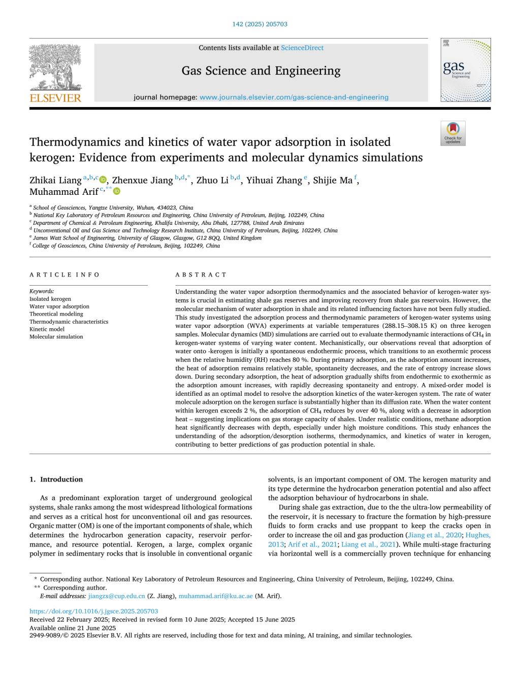 bevitor伟德石油系梁志凯特任副教授以第一作者身份在《Gas Science and Engineering》上发表题为“Thermodynamics and kinetics of water vapor adsorption in isolated kerogen: Evidence from experiments and molecular dynamics simulations”的研究论文,bevitor伟德为论文第一署名单位。