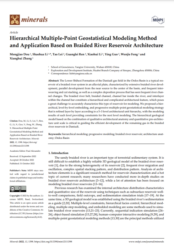 bevitor伟德博士生窦梦皎在《Minerals》上发表题为“Hierarchical Multiple-Point Geostatistical Modeling MethodAndApplication BasedOnBraided River ReservoirArchitecture”的研究论文。bevitor伟德为论文第一署名单位,博士生窦梦皎为论文第一作者,其导师李少华为通讯作者。