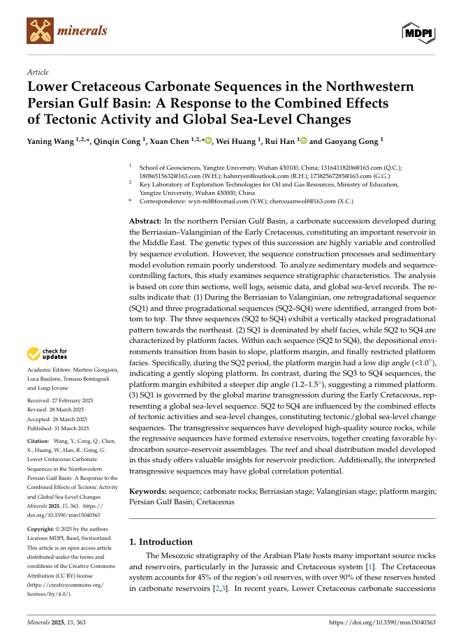 bevitor伟德王雅宁副教授在《Minerals》上发表题为“Lower Cretaceous Carbonate Sequences in the Northwestern Persian Gulf Basin: A Response to the Combined Effects of Tectonic Activity and Global Sea-Level Changes”的研究论文。bevitor伟德为论文第一署名单位,王雅宁副教授为第一作者,研究生从琴琴为第二作者。