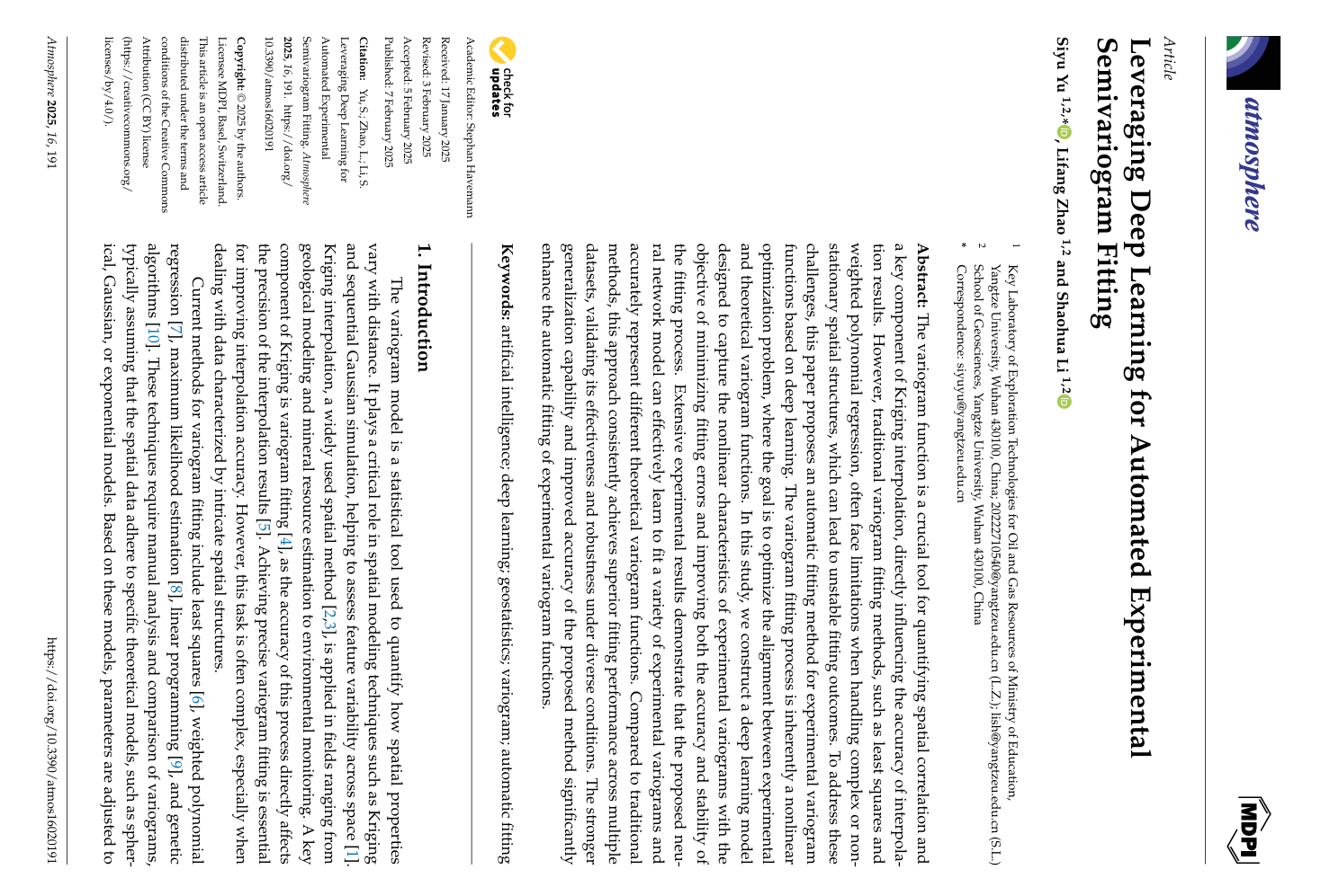 bevitor伟德硕士研究生赵丽芳在《Atmosphere》上发表题为“Leveraging Deep Learning for Automated Experimental Semivariogram Fitting”的论文,bevitor伟德为论文第一署名单位,研究生赵丽芳为第二作者,其导师喻思羽副教授为该论文的第一作者和通讯作者。