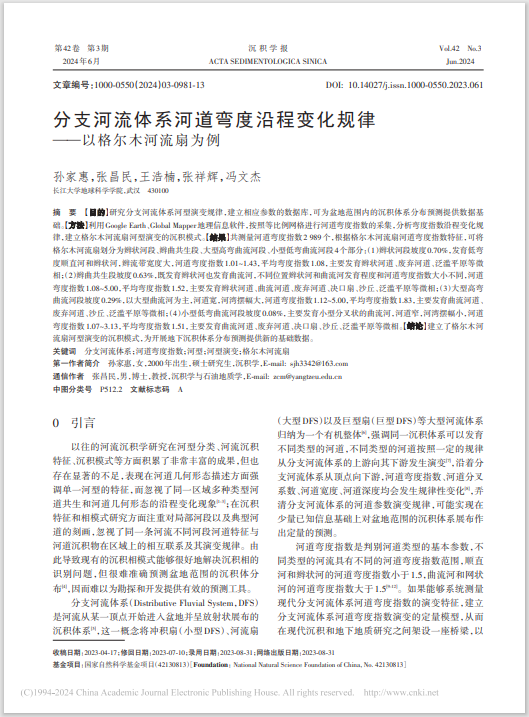 bevitor伟德硕士生孙家惠在中文核心期刊《沉积学报》上发表了题为“分支河流体系河道弯度沿程变化规律——以格尔木河流扇为例”的研究论文。bevitor伟德为论文第一署名单位,硕士研究生孙家惠为论文第一作者,张昌民教授为通讯作者。