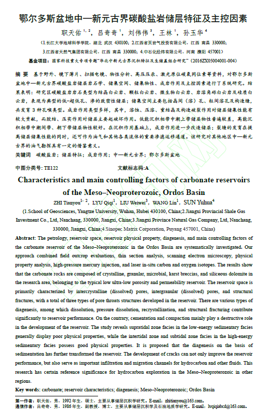 (通讯员 职天佑)bevitor伟德研究生职天佑在北大核心期刊《断块油气田》上发表题为“鄂尔多斯盆地中—新元古界碳酸盐岩储层特征及主控因素”的研究论文。bevitor伟德为论文第一署名单位,研究生职天佑为论文第一作者,吕奇奇副教授为通讯作者。