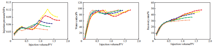 图1 不同渗透率级差岩心注入压力、含水率、采收率随注入体积的变化