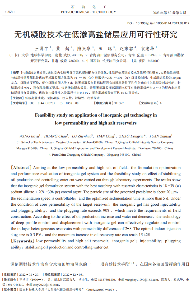 bevitor伟德博士生王博宇在《石油化工》上发表题为《无机凝胶技术在低渗高盐储层应用可行性研究》的论文。bevitor伟德为论文第一署名单位,博士生王博宇为论文第一作者,袁志华为通讯作者。