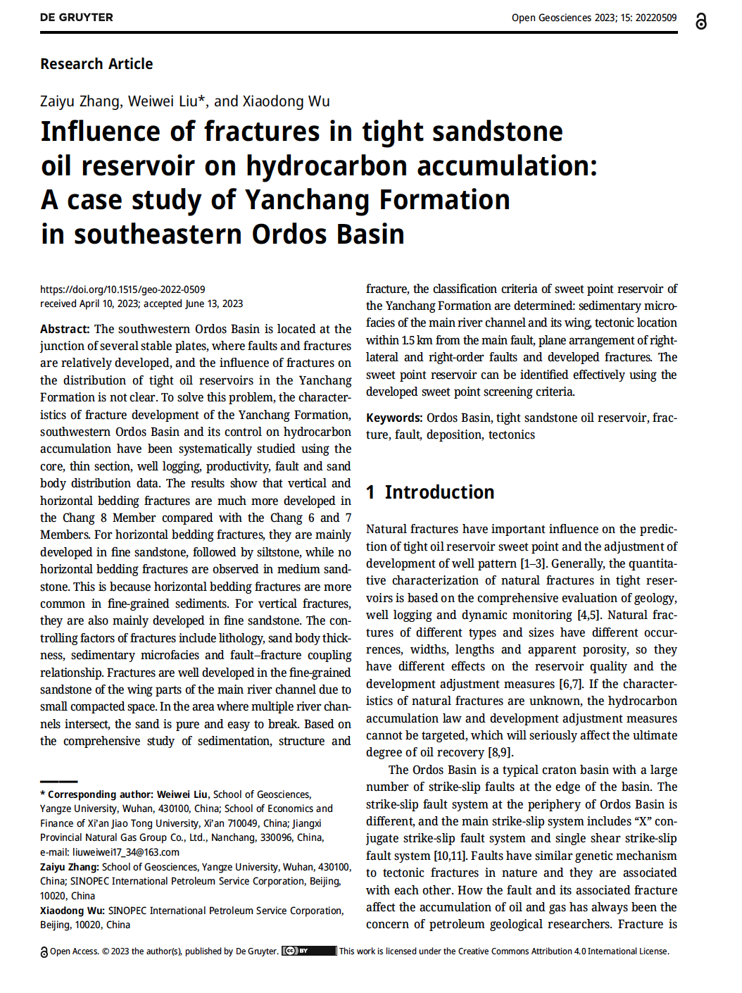 bevitor伟德硕士生张在玉在SCI收录期刊《Open Geosciences》上发表题为“Influence of fractures in tightsandstoneoil reservoir on hydrocarbon accumulation: A case study of Yanchang Formation in southeastern Ordos Basin”的研究论文,bevitor伟德为论文第一署名单位,硕士生张在玉为论文第一作者,指导老师刘伟伟为通讯作者。