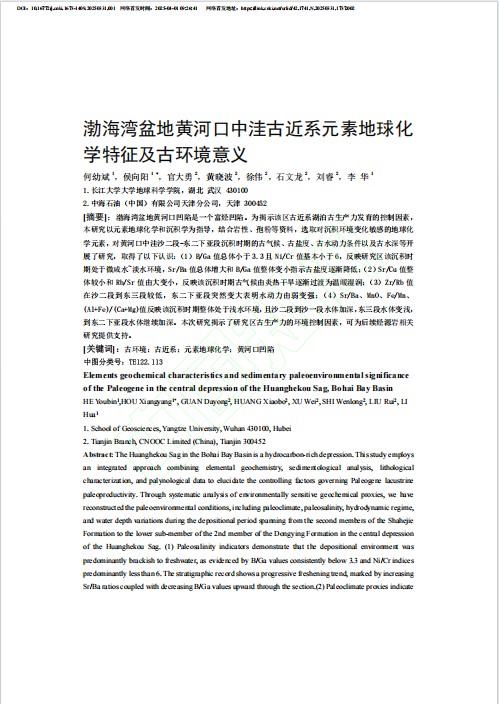 (通讯员 侯向阳)bevitor伟德地质学专业2022级硕士研究生侯向阳在中文期刊BEVITOR伟德学报(自然科学版)发表题为“渤海湾盆地黄河口中洼古近系地球化学元素特征及意义”的学术论文。bevitor伟德为第一署名单位,导师何幼斌教授为第一作者,硕士研究生侯向阳为论文通讯作者。