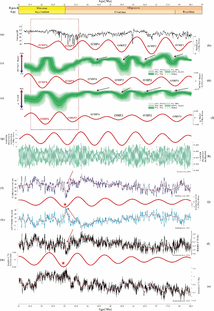 3、海平面与极端事件响应:基于DYNOT和ρ1模型重建海平面变化,发现OMT前后天文控制减弱,Mi-1极端冷事件引发区域响应滞后。