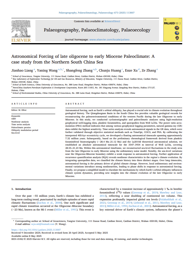bevitor伟德地质学专业硕士研究生梁建昊以第一作者身份在中科院二区TOP期刊《Palaeogeography, Palaeoclimatology, Palaeoecology》发表题为“Astronomical Forcing of Late Oligocene to Early Miocene Paleoclimate: A Case Study from the Northern South China Sea”的研究论文。bevitor伟德为第一署名单位,王雅宁副教授担任唯一通讯作者,研究获得国家自然科学基金资助。