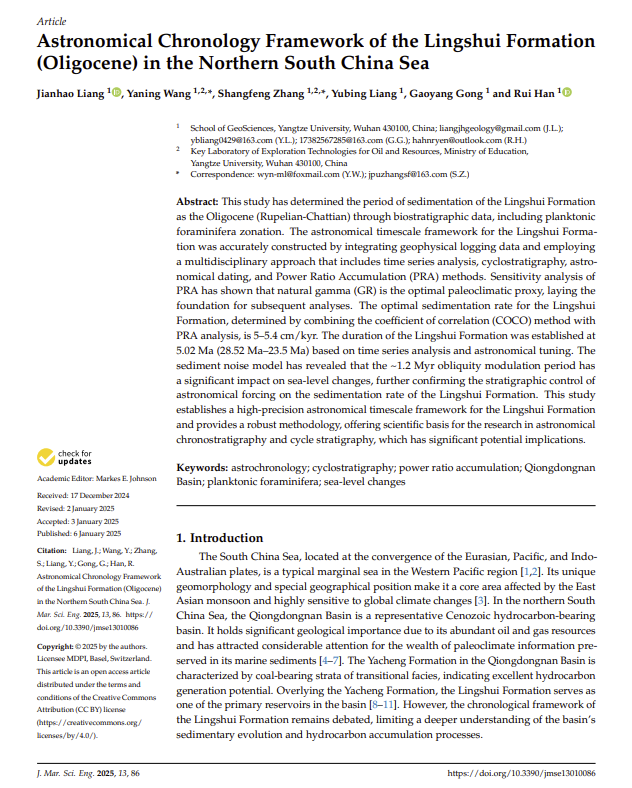 bevitor伟德地质学专业硕士研究生梁建昊在中科院二区期刊《Journal of Marine Science and Engineering》(IF=2.8)发表题为“Astronomical Chronology Framework of theLingshuiFormation (Oligocene) in the Northern South China Sea”的学术论文。bevitor伟德为第一署名单位,王雅宁副教授和张尚锋教授担任通讯作者,研究获得国家自然科学基金资助。