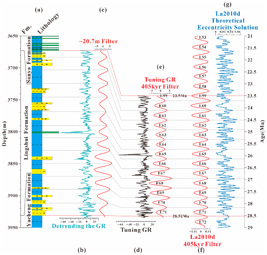 古气候代用指标在天文年代学研究中的重要性毋庸置疑。然而,含油气盆地常用的地球物理测井曲线天文敏感性并不明朗,误将缺乏敏感性的曲线用于调谐分析,易产生大量假阳性结果。本研究以浮游有孔虫确立生物年代基准,采用功率比累积(PRA)方法定量评估各类测井数据的天文敏感性,筛选出最优古气候代用指标。进而构建陵水组的高精度天文年代框架,并深入揭示轨道强迫对海平面变化的驱动机制,为未来相关研究提供可复制的方法论。