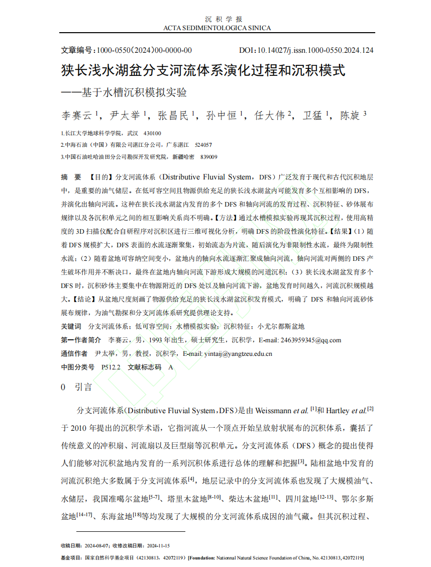 bevitor伟德研究生李赛云在《沉积学报》上发表题为“狭长浅水湖盆分支河流体系演化过程和沉积模式——基于水槽沉积模拟实验”的研究论文。bevitor伟德为论文第一署名单位,研究生李赛云为论文第一作者,其导师尹太举教授为通讯作者。