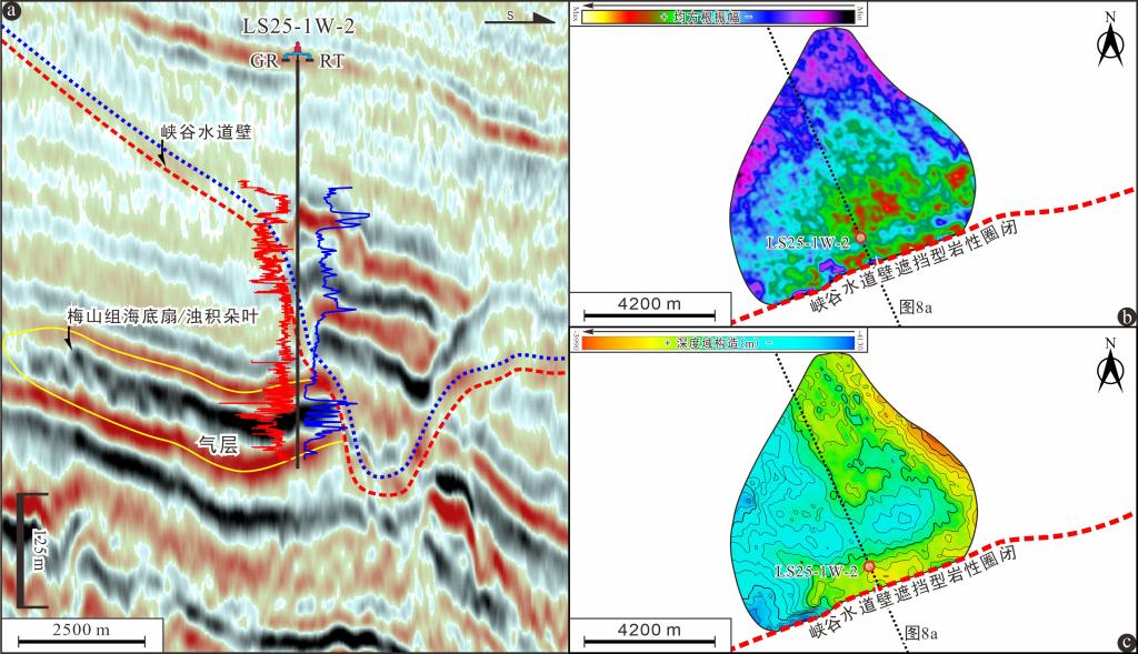 图1过井(LS25-1W-2)地震(图a)及其对应均方根平面属性图(图b)和构造图(图c)描述了峡谷水道壁遮挡海底扇砂岩形成岩性圈闭的典型实例