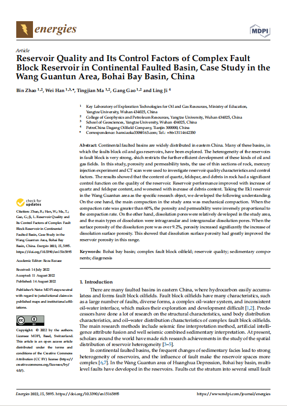 bevitor伟德硕士生韩微在《Energies》发表题为“Reservoir Quality and Its Control Factors of Complex Fault Block Reservoir in Continental Faulted Basin, Case Study in the Wang Guantun Area, Bohai Bay Basin, China”的研究论文。文章主要研究中国东部广泛分布着陆相断陷盆地中碎屑岩储层的储层质量及控制因素。断层对油气藏具有封堵作用,断块内储层非均质性极强,严重制约了此类油气田的高效开发。本研究通过孔隙度与渗透率测试、岩石薄片鉴定、压汞实验及CT扫描等技术手段,系统分析了储层质量特征及其控制因素。结果表明:岩石中石英、长石与岩屑含量对储层质量具有显著控制作用——石英与长石含量增加时储层物性改善,岩屑含量增加时储层物性恶化。以王官屯地区EKI储层为具体研究对象,得出以下认识:一方面,研究区压实作用以机械压实为主,当压实率超过60%时,孔隙度与渗透率随压实率增大而降低;另一方面,研究区溶蚀孔隙较发育,主要发育粒内溶孔与粒间溶孔两类,当溶蚀面孔率超过9.2%时,孔隙度随溶蚀面孔率增大显著提升,表明该区间溶蚀作用对储层孔隙改善效果显著。