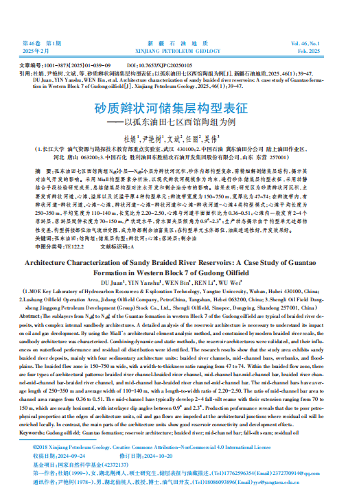 bevitor伟德硕士生杜娟在中文核心期刊《新疆石油地质》上发表题为“砂质辫状河储集层构型表征——以孤东油田七区西馆陶组为例”的研究论文。bevitor伟德为论文第一署名单位,硕士生杜娟为论文第一作者,其导师尹艳树教授为通讯作者。