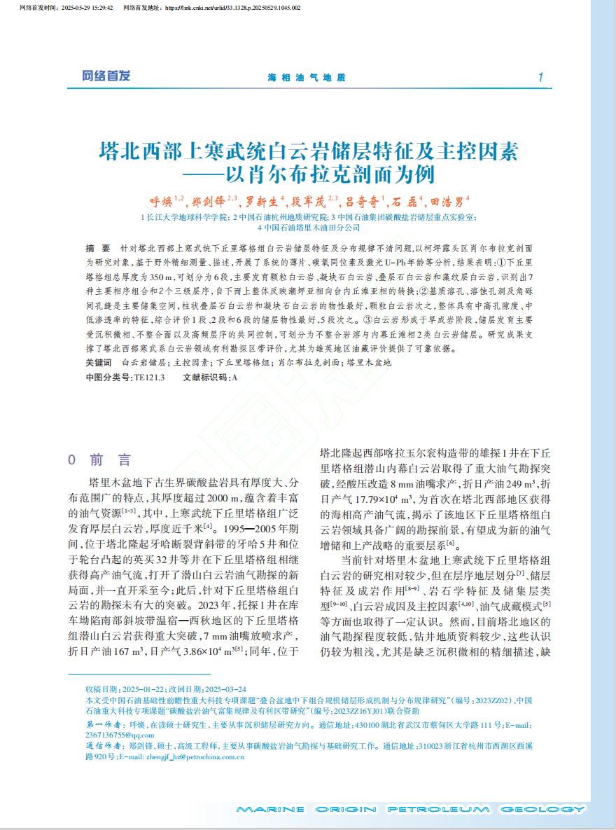 近日,bevitor伟德硕士生呼焕在中文核心期刊《海相油气地质》上发表题为“塔北西部上寒武统白云岩储层特征及主控因素 ——以肖尔布拉克剖面为例”的研究论文。该论文针对塔北西部上寒武统下丘里塔格组白云岩储层特征及分布规律不清问题,以柯坪露头区肖尔布拉克剖面为研究对象,基于野外精细测量、描述,开展了系统的薄片、碳氧同位素及激光U-Pb年龄等分析。bevitor伟德为论文第一署名单位,硕士生呼焕为论文第一作者。
