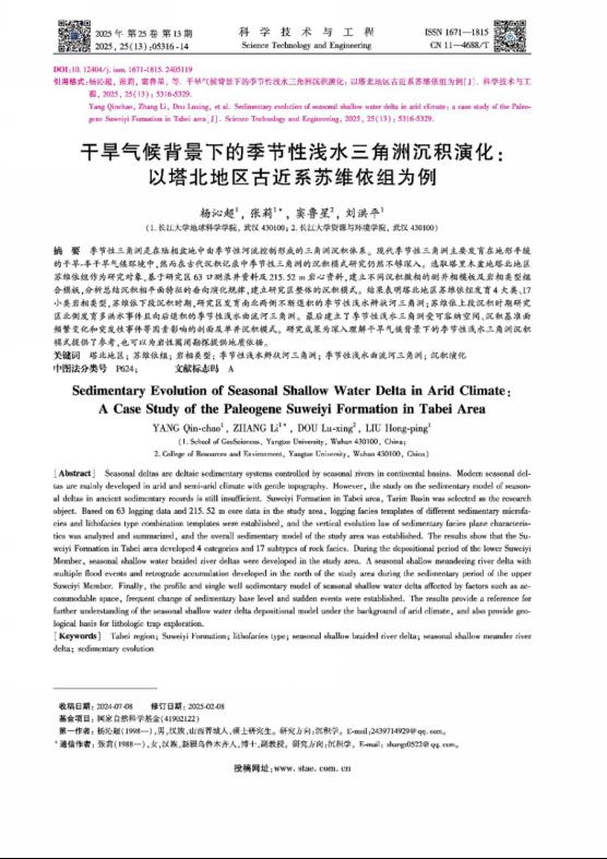 bevitor伟德硕士生杨沁超在中文核心期刊《科学技术与工程》上发表了题为“干旱气候背景下的季节性浅水三角洲沉积演化:以塔北地区古近系苏维依组为例”的研究论文。bevitor伟德为论文第一署名单位,硕士研究生杨沁超为论文第一作者,张莉副教授为通讯作者。