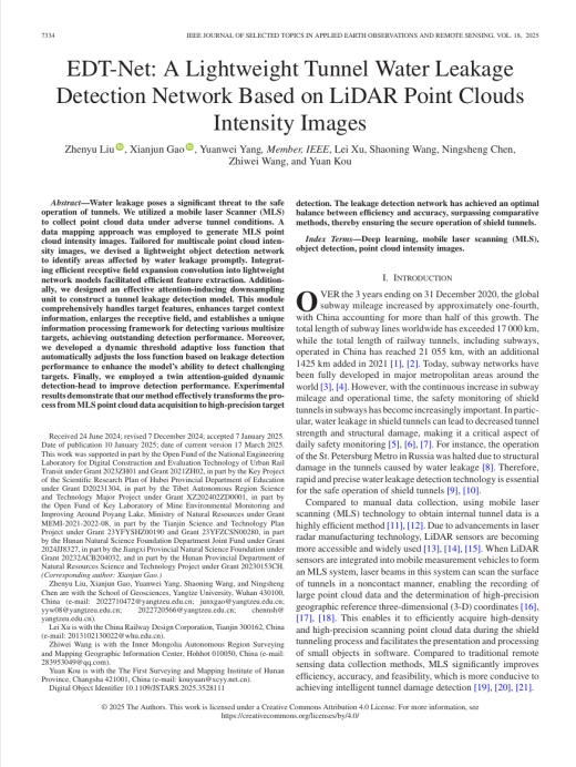 bevitor伟德研究生刘振宇以第一作者身份在SCI期刊《IEEE Journal of Selected Topics in Applied Earth Observations and Remote Sensing》上发表题为“EDT-Net: A Lightweight Tunnel Water Leakage Detection Network Based on LiDAR Point Clouds Intensity Images”的研究论文,bevitor伟德为论文第一署名单位,研究生刘振宇为第一作者,副教授高贤君为论文通讯作者。