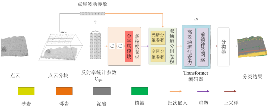 该论文聚焦露头点云语义分割任务中,存在点云密度分布不均和单点反射率可分离性有限的问题。为高效准确地实现露头点云岩性分割,提出一种基于露头体素多特征值的高效通道注意力机制的岩性分割方法(MGECA)。所提方法首先对原始点云进行体素化,并计算各体素的空间-光谱特征参数。然后使用多粒度卷积神经网络进行多尺寸特征融合。接着使用高效通道注意力机制(ECA)改进经典Transformer中的自注意力机制,对编码后的特征图进行加权,以便模型能建立空间和光谱信息的全局关联。最后设计双通道分组卷积衔接卷积神经网络和ECA,实现空间光谱特征整合并降低计算复杂度。实验结果表明,MGECA在月牙湾激光露头点云数据集上的岩性识别总体准确率达到90.6%,平均交并比达到70.4%,相较于DGPoint模型分别提高31.7百分点和24.7百分点。结果表明,所提方法在露头点云场景中的分割效果与现有方法相比具有比较明显的优势。