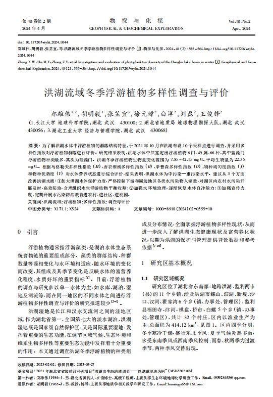 bevitor伟德博士生郑雄伟在《物探与化探》上发表题为“洪湖流域冬季浮游植物多样性调查与评价”的研究论文。该论文通过调查洪湖冬季浮游植物的种类组成及分布情况,全面掌握了浮游植物多样性现状,深入研究了洪湖生态健康现状及富营养化状况,为洪湖的保护与管理提供了背景数据和参考依据。
