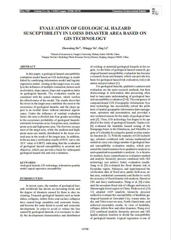 bevitor伟德研究生于茗鸽以第二作者身份在环境科学领域SCI期刊《Fresenius Environmental Bulletin》上发表了题为“EvaluationofGeologicalHazardSusceptibilityinLoessDisasterAreaBasedonGISTechnology”的研究论文。该论文以BEVITOR伟德为第一署名单位,bevitor伟德副教授何贞铭为第一作者,研究生于茗鸽为第二作者。
