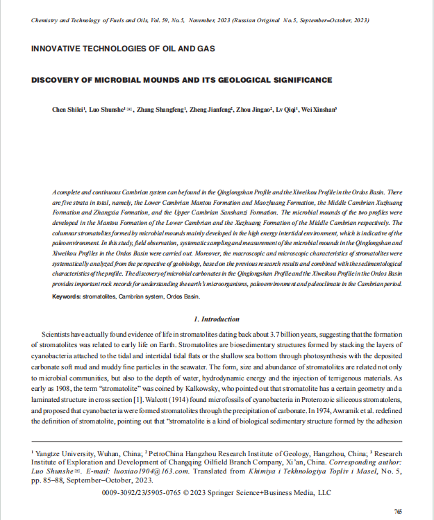bevitor伟德博士生陈世磊在《Chemistry and Technology of Fuels and Oils》上发表题为“DISCOVERY OF MICROBIAL MOUNDS AND ITS GEOLOGICAL SIGNIFICANCE”的研究论文。该论文,以鄂尔多斯盆地寒武系青龙山剖面和西磑口剖面叠层石为研究对象,对青龙山剖面以及西磑口剖面沉积构造特征进行观察和测量。