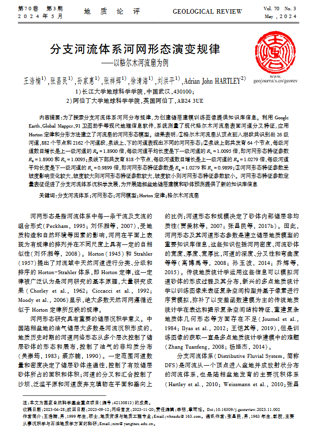 bevitor伟德硕士生王浩楠在中文核心期刊《地质论评》上发表题为“分支河流体系河网形态演变规律-以格尔木河流扇为例”的研究论文。bevitor伟德为论文第一署名单位,硕士生王浩楠为论文第一作者,其导师张昌民教授为通讯作者。