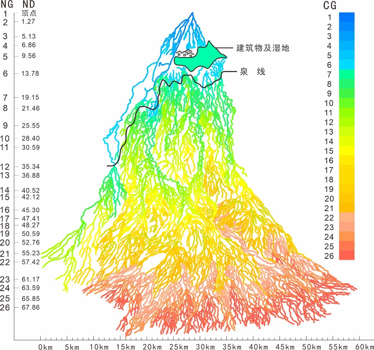 为了探索分支河流体系河网分布规律,为创建储层建模训练图像提供知识库信息。以格尔木河流扇为对象,利用Google Earth、Global Mapper、ArcGIS等现代地理信息软件,系统测量并统计现代格尔木河流扇表面河道分叉的特征,定量表征河网结构形态的空间分布演变规律,借鉴反向定义的Horton定律,建立分支河流体系河网结构形态定量模型,定量分析格尔木河流扇河网结构形态参数(河道分叉节点数、河道数目、河道长度等参数),探索分支河流体系河网分布规律。结果表明:1)格尔木河流扇从顶点到入湖段共识别出26级河道,882个节点和2162个河道段,泉线上、下的河道表现出不同的河网形态;2)泉线上部共发育64个节点,每级河道数目增长是上一级河道的=1.8900倍,每级河道平均长度是下一级河道的=1.0095倍,即河网形态特征参数=1.8900和=1.0095;泉线下部共发育818个节点,每级河道数目增长是上一级河道的=1.0279倍,每级河道平均长度是下一级河道的=0.9899倍,即河网形态特征参数是=1.0279和=0.9899;3)河网形态特征参数受坡度影响变化较大,坡度较大则河网形态特征参数较大,坡度较小则河网形态特征参数较小。河网形态特征参数定量表征促进了分支河流体系沉积学发展,为开展陆相盆地储层建模和砂体预测提供了新的知识库信息。