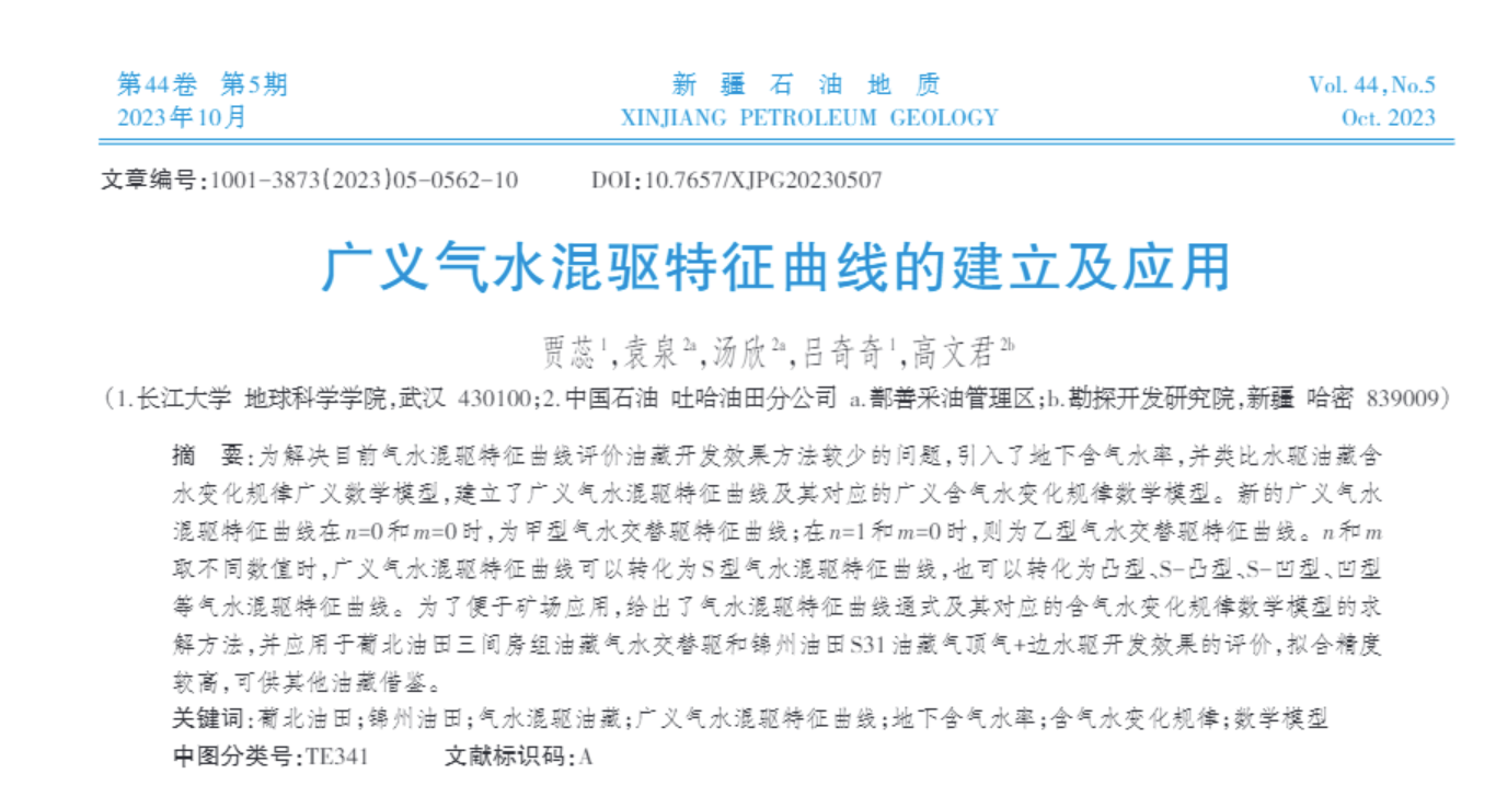 2023年9月26日,bevitor伟德22级硕士研究生贾蕊在《新疆石油地质》上发表题为“广义气水混驱特征曲线的建立及应用”的研究论文,bevitor伟德为论文第一署名单位,硕士研究生贾蕊为论文第一作者。