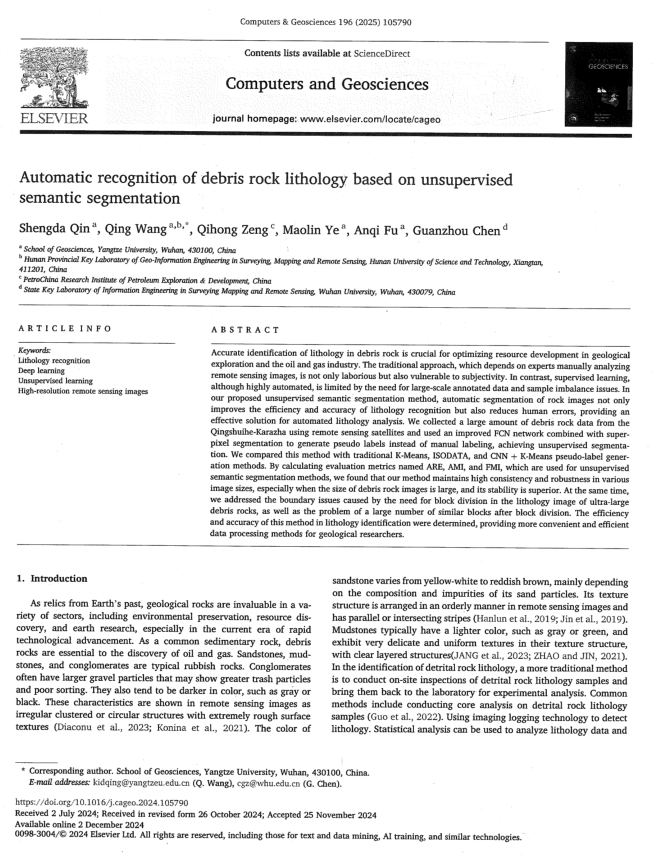 近日,bevitor伟德测绘工程专业2025级硕士生秦声炟在SCI-2区期刊《Computers & Geosciences》发表题为“Automatic recognition of debris rock lithology based on unsupervised semantic segmentation”的研究论文。bevitor伟德为论文第一署名单位,硕士生秦声炟为论文第一作者,其导师王庆副教授为通讯作者。