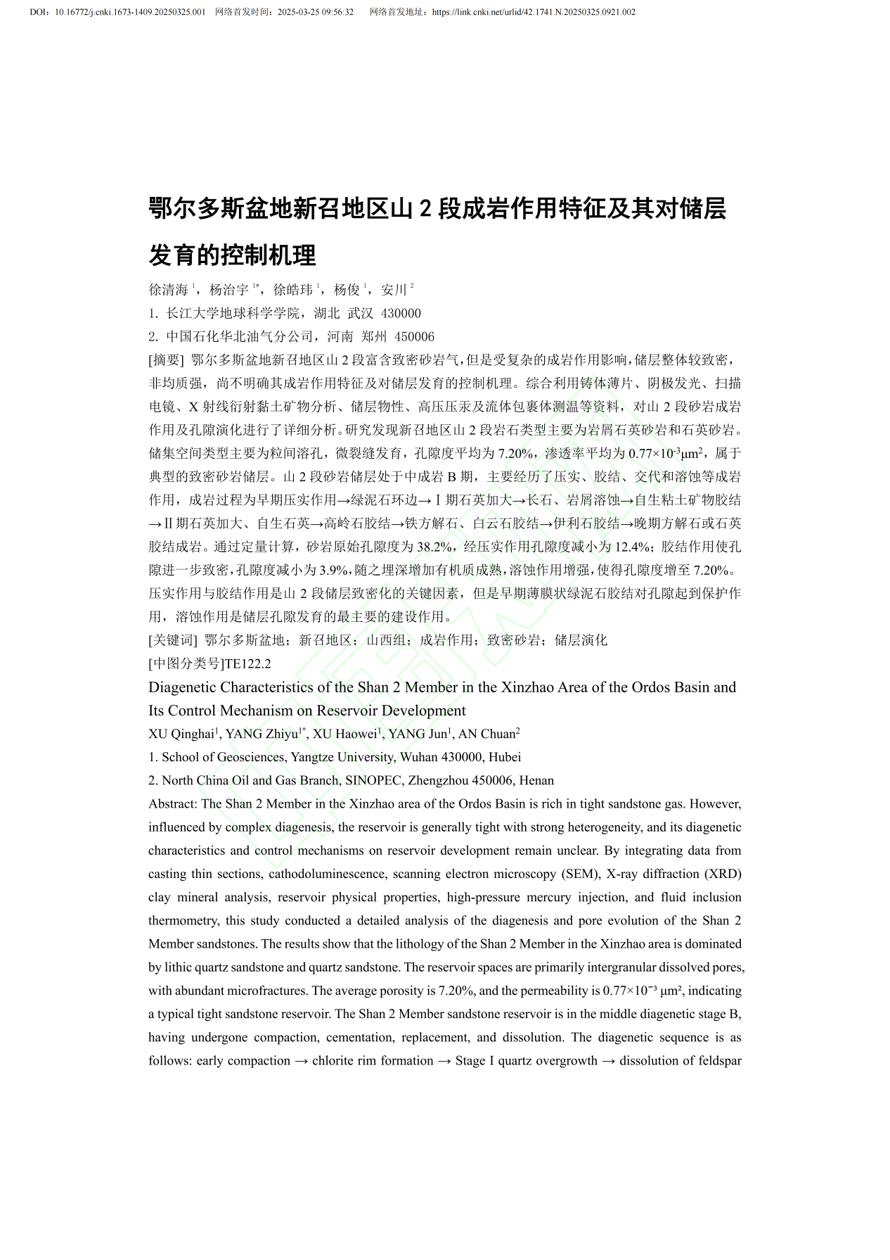 bevitor伟德硕士生杨治宇在《BEVITOR伟德学报》上发表题为“鄂尔多斯盆地新召地区山2段成岩作用特征及其对储层发育的控制机理”的研究论文,bevitor伟德为论文第一署名单位,徐清海副教授与杨治宇为共同第一作者。